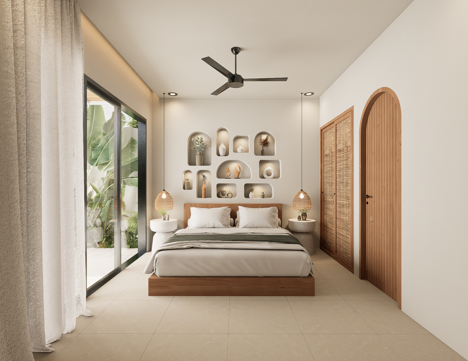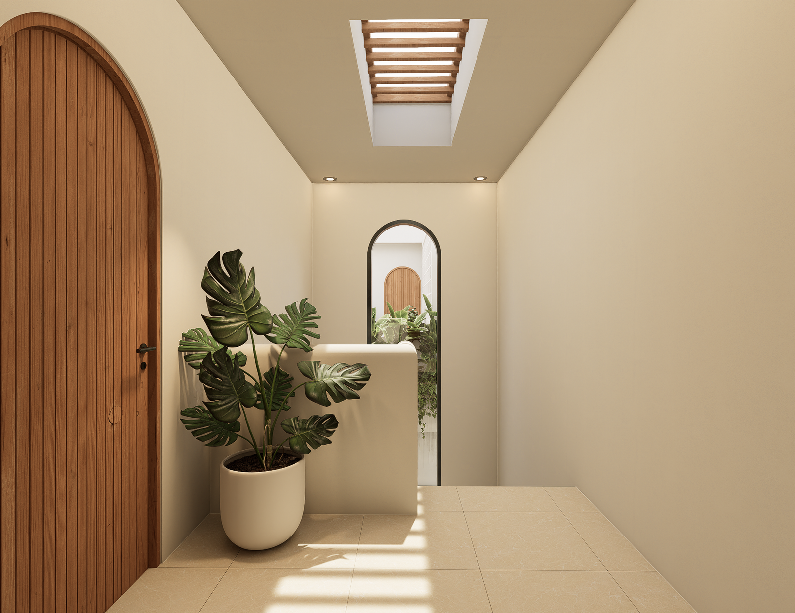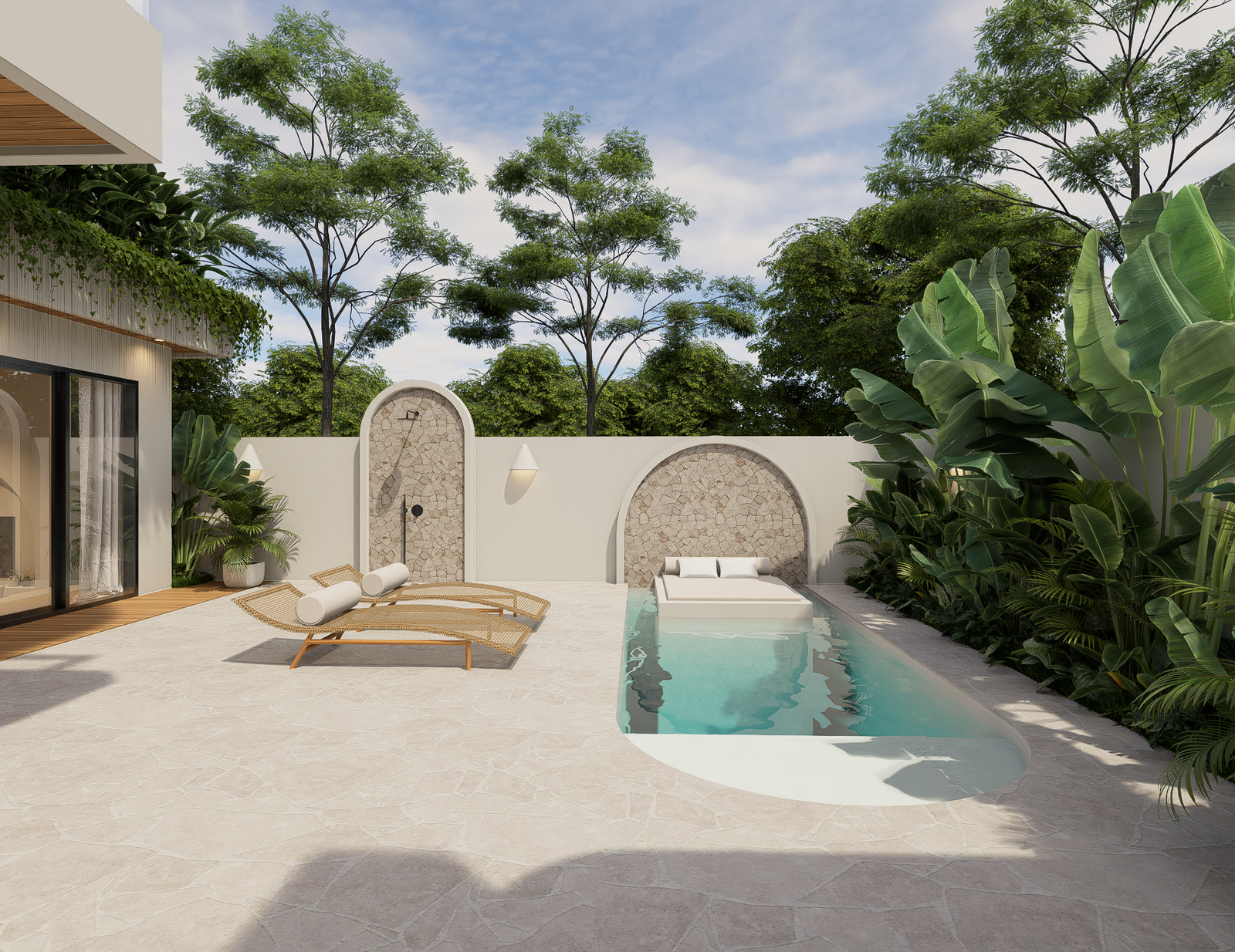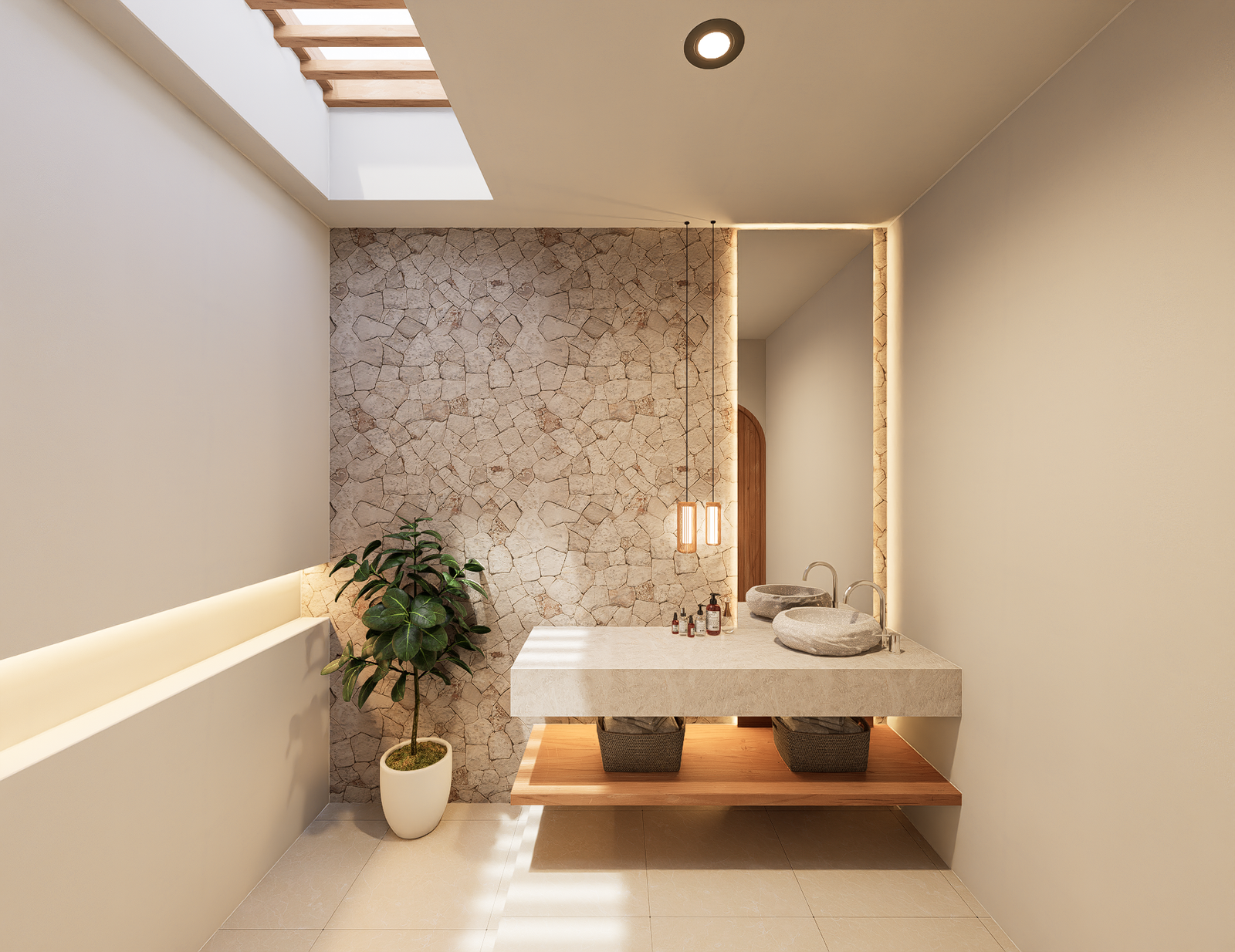 Set in Balangan, this villa takes a minimalist Mediterranean architecture and gives it a more relaxed, lifestyle-driven character. The design relies on a quiet palette of sand tones, timber, stone, and plaster, while arched features and curved transitions give the architecture a softer silhouette. Rather than feeling decorative, every element is edited back to feel intentional, creating a home that looks polished, current, and naturally suited to Bali’s atmosphere. The interior follows the same refined approach. In the bedroom, built-in display niches become a defining feature, adding a unique taste of personality. The bathroom feels more immersive, with a skylit ceiling, textured stone backdrop, and a vanity composition that elevates the elegance of everyday routines. Across the spaces, the design allows light, proportion, and material contrast to do the work.